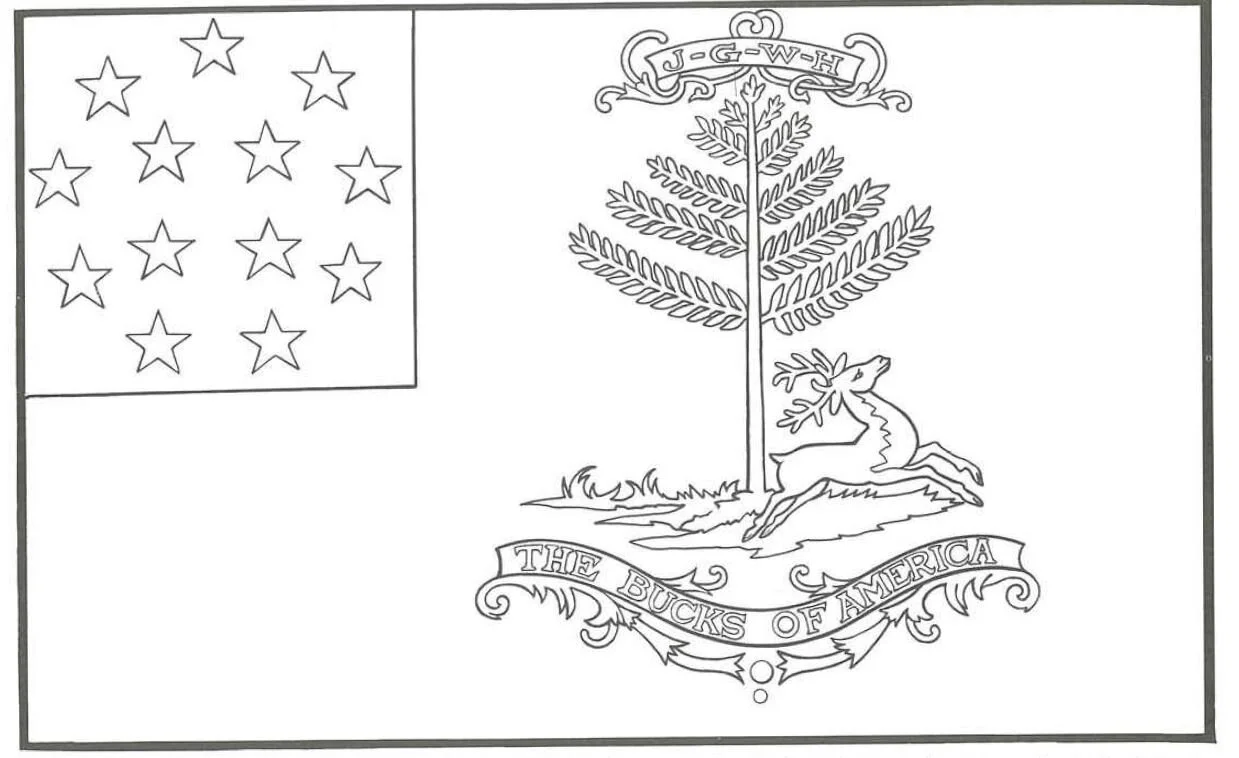BUCKS OF AMERICA Colors: Buff field, letters; white stars; blue canton, scrolls, flourishes; green leaves, grass; brown buck, trunk. John Hancock, Governor of Massachusetts, presented this flag after the war to a company of black soldiers for valor. We know little about the Bucks of America; they were among the thousands of black Revolutionary patriots.