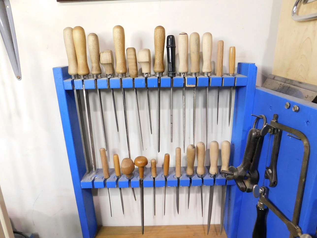 Watch what you file. A hard piece of metal can ruin a file in just a few strokes. Don’t expect the file you used for testing that knife blade you just hardened to be good for anything else. When it skated across that hard surface it got dull fast. I’ve got one old file for testing blades and that’s pretty much all it does. Keep your files separated from each other. Sliding together in a drawer or banging against each other will dull them quick. A file rack can help to prolong their life.
